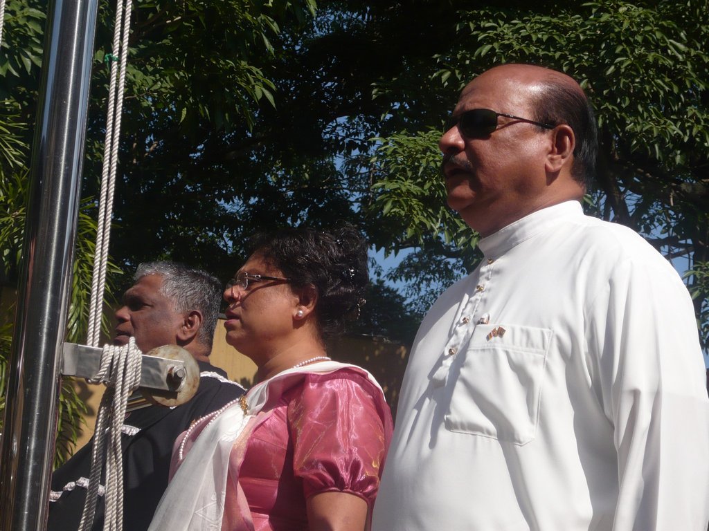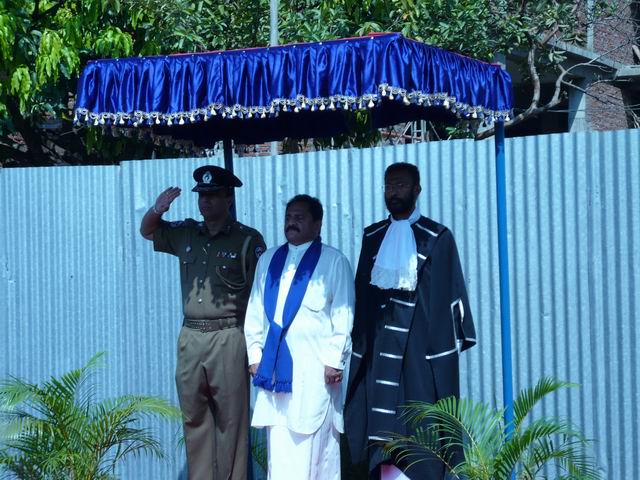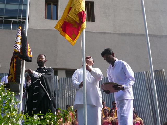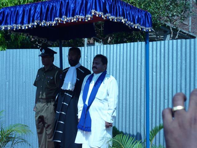 | 2) Hoisting the National Flag and the Provincial Flag the Hon. Chief Minister and the Chairman to the Central Province | 5) Hon. Member Uwais, Hon. Chief Minister, Chairman, Chief Whip Hon. K.K. Piyadasa of the Opposition, Hon. Member J. Jailabdeen and some officers and invitees (from the left end)in front of the Assembly Hall before the Opening of the Session | 8) Sergeant-at-Arms placing the Mace on the Standing Holder |