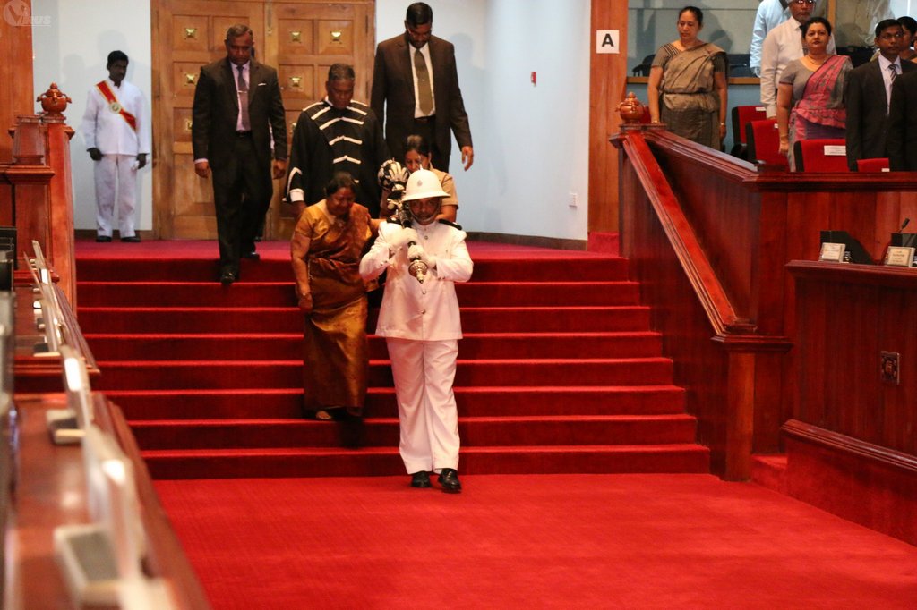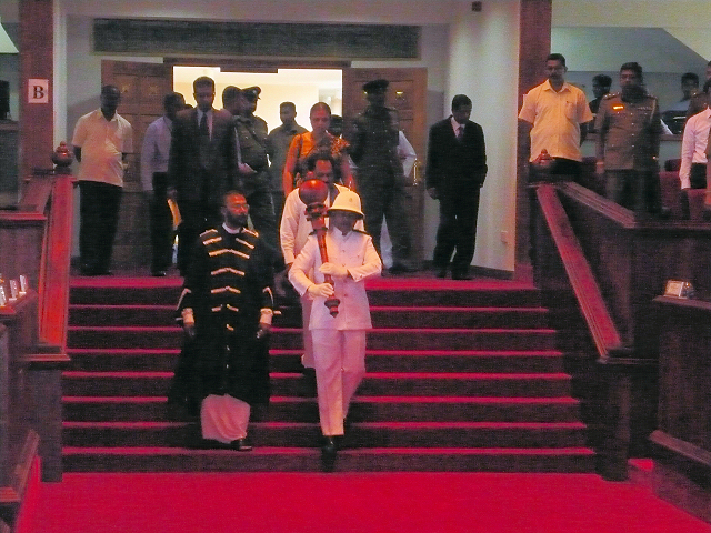 | 3) Chief Secretary, Council Secretary,Secretaries to the Provincial Ministries and All the secretaries representing local government bodies stood attention for the Nation Anthem | 6) Recitation of "Jayamangala Gatha" and "Devo Wassatu Kalena" at the door step of the Assembly Hall | 9) Announcement of the proclamation of the opening session by the Assembly Secretary |