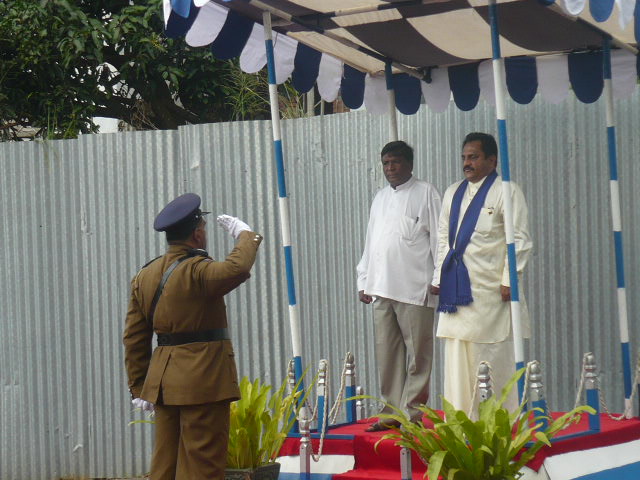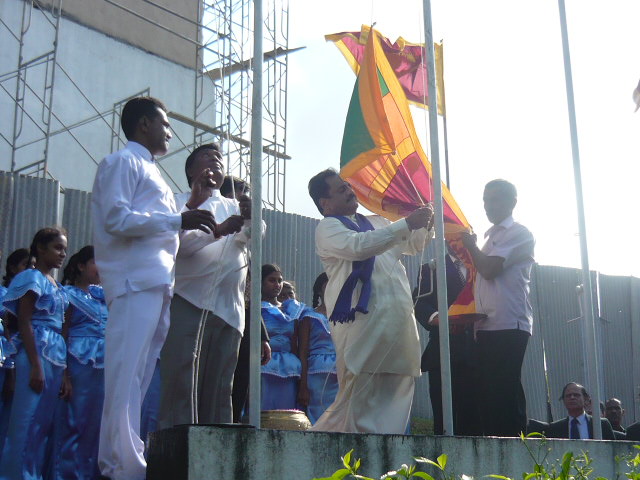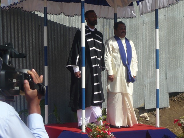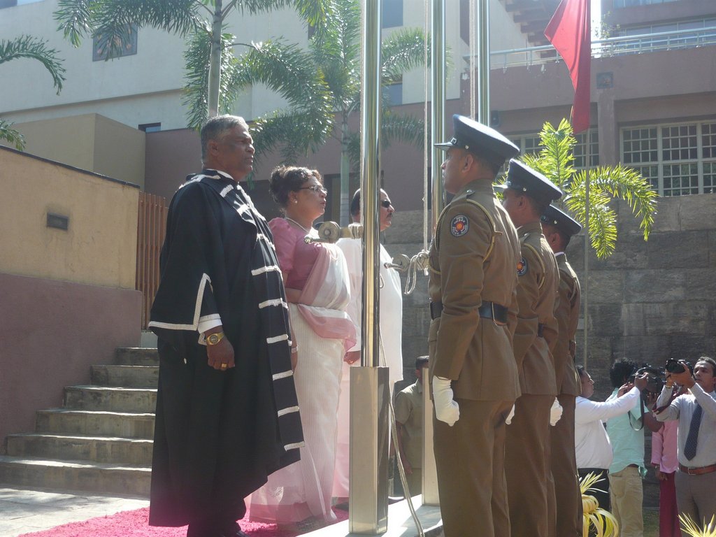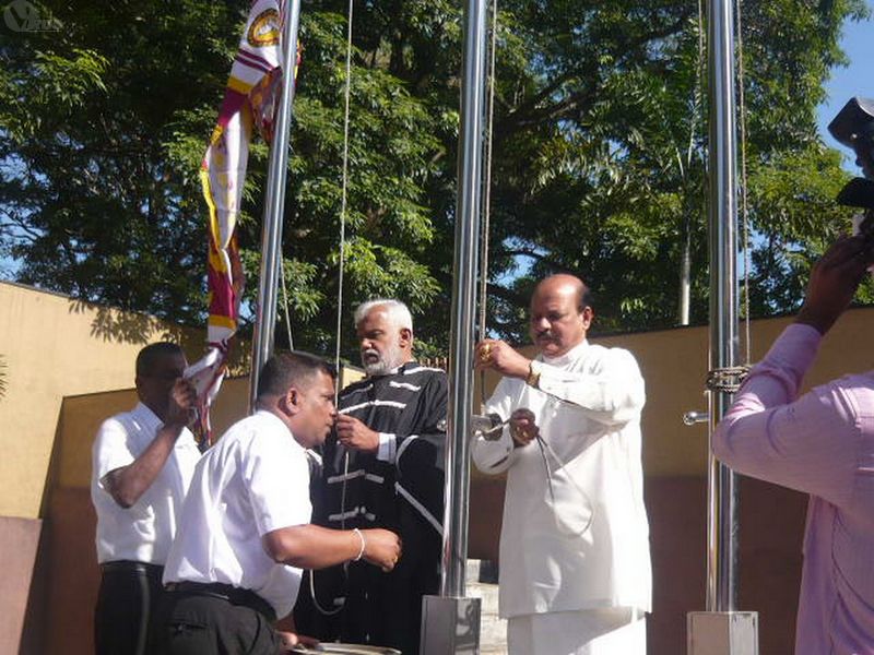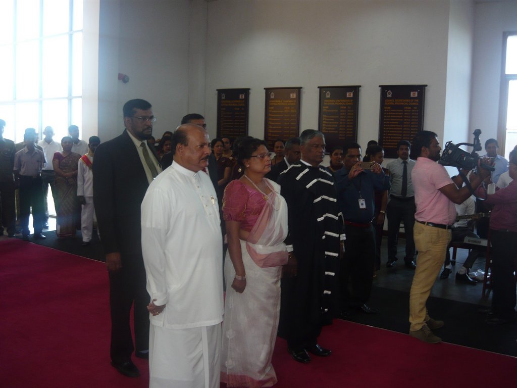 | 2) Hoisting the National Flag and the Provincial Flag the Hon. Chief Minister and the Chairman to the Central Province | 5) Hon. Member Uwais, Hon. Chief Minister, Chairman, Chief Whip Hon. K.K. Piyadasa of the Opposition, Hon. Member J. Jailabdeen and some officers and invitees (from the left end)in front of the Assembly Hall before the Opening of the Session | 8) Sergeant-at-Arms placing the Mace on the Standing Holder |